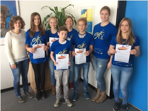 Foto: Die neuen Sporthelfer Lara Driesang, Amelie Limburg, Max Marschollek, Kim Sindermann, Nick Strathmann, Angelina Biela und Janina Rogasik (es fehlen: Fabian Hielscher, Asena Kilic, Rieke Müller und Marissa Perret) mit Frau Leser