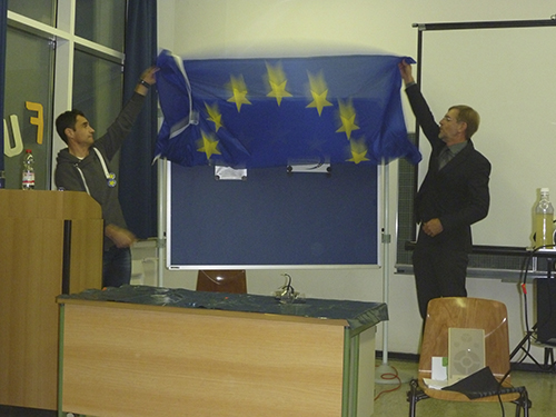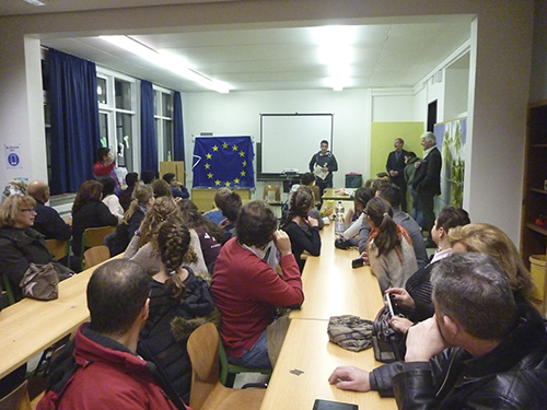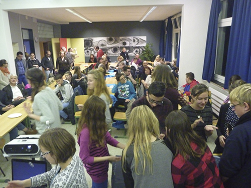 Außer der Reihe, aber dafür zum Erasmus-Gedanken passend, fanden sich die Gastlehrerinnen und –lehrer bereit, mit Schülerinnen und Schülern eines Sowi-Kurses und auch untereinander über Europa zu diskutieren. Alle fanden diese Aussprache, die in der „Besuchssprache“ Englisch stattfand, sehr informativ und anregend (s. Foto).