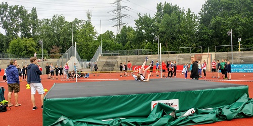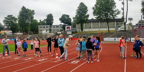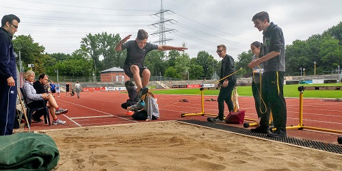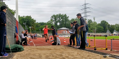 So helfen bei den Bundesjugendspielen nicht nur Sportlehrerinnen und -lehrer mit, sondern das komplette Kollegium ist bis auf ein paar wenige notwendige Ausnahmen tatkräftig an den verschiedenen Sportstätten zuständig und sorgt beispielsweise beim Weitwurf, Weit- und Hochsprung sowie an der Laufbahn und im Rechenzentrum für reibungslose Abläufe. Dort wurde geharkt, gemessen, die Zeit gestoppt, angefeuert und bei kleinen Unfällen auch verarztet.