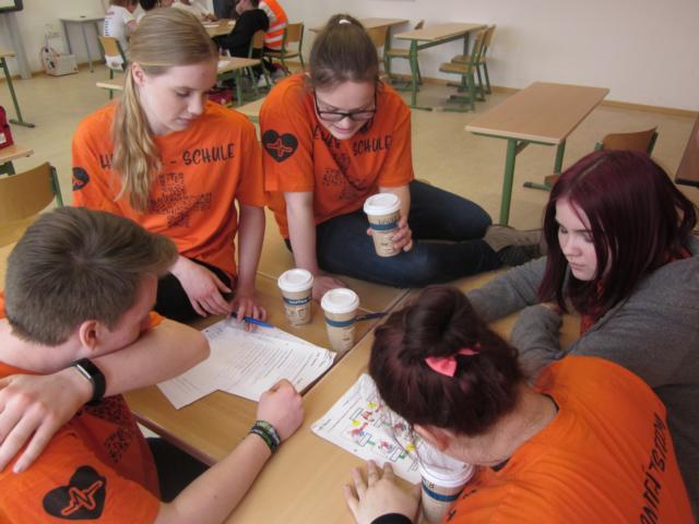 Sara, Anna, Naya, Annemarie und Ole mussten ihre Fähigkeiten in den unterschiedlichsten Disziplinen unter Beweis stellen. Das JRK ließ sich viele kniffelige und ziemlich anspruchsvolle Aufgaben einfallen, um die SSD-Teams so richtig ins Schwitzen zu bringen. Es galt, sich in Theorie und Praxis zu behaupten. Die Teilnehmer mussten in diversen Simulationen beweisen, dass sie einzeln und im Team die nötigen Erste-Hilfe-Maßnahmen im Schlaf beherrschen: Ob Fingeramputationen in der Schulcafeteria oder ein Baustellenumfall mit mehreren Verletzten, all diese Herausforderungen meisterte das Team der Hellweg-Schule äußerst kompetent und immer mit der nötigen Ruhe!